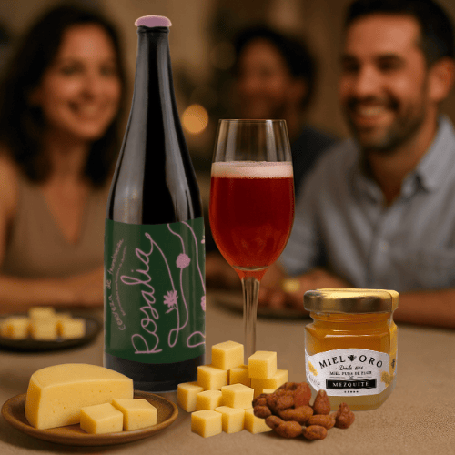 Cerveza artesanal de frambuesa refermentada con levadura de champagne, color vibrante y frescura frutal en cada sorbo.